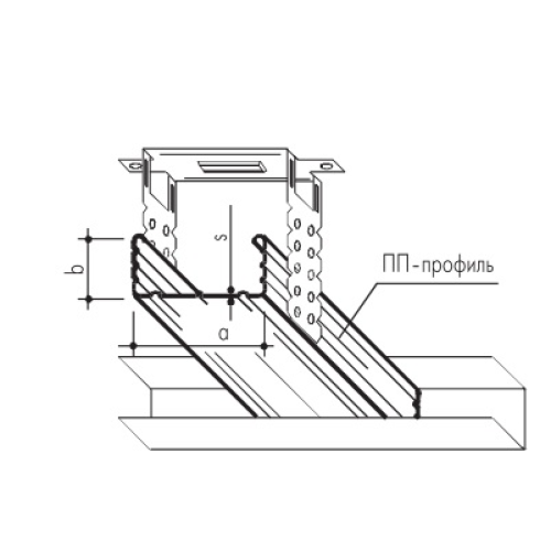 Потолочный профиль имеет С-образную форму и предназначен для устройства каркасов подвесных потолков и облицовок стен. Полки ПП-профиля имеют по три гофра, придающих ему дополнительную жесткость. Стенка профиля также имеет три гофра – один в центре и два более широких по краям. Крепление ПП-профиля к несущим основаниям (перекрытиям) осуществляется при помощи специальных подвесов. Края полок профиля загнуты внутрь, и за счет этого он висит на подвесе с зажимом. Прямые подвесы крепятся на профиле при помощи винтов LN. Широкая (60 мм) стенка служит удобным основанием для крепления КНАУФ-листов или КНАУФ-суперлистов. С использованием специальных соединителей, входящих в комплект подвесного потолка, ПП-профиль позволяет произвести быстрый и несложный монтаж.